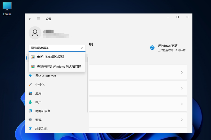 1、打開設置窗口,點擊搜索框,輸入網絡疑難解答。