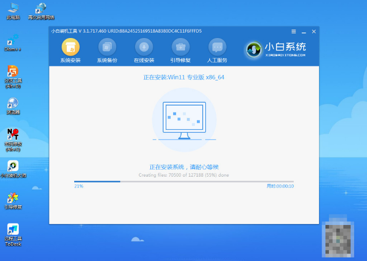 5、電腦進入pe系統后,小白裝機工具自動開啟并安裝win11系統,耐心等待。
