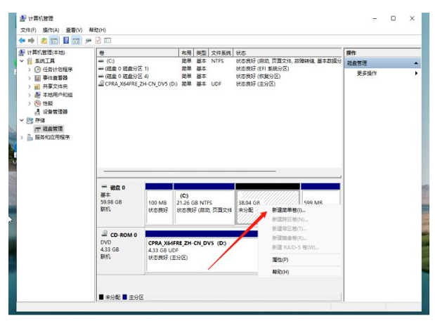 5、提示壓縮完成后,系統磁盤會有一個未分配的分區,鼠標選中后右擊,選擇新建簡單卷。