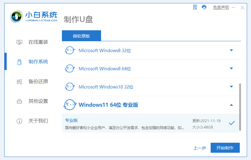 2、選擇本次需要重裝的windows11 64位,點擊開始制作。