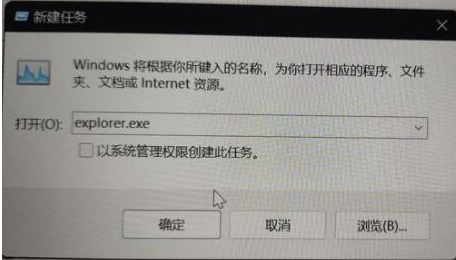 4.在新建任務中輸入“explorer.exe”勾選下方管理權限,再單擊“確定”就可以修復升級win11后黑屏的問題啦。
