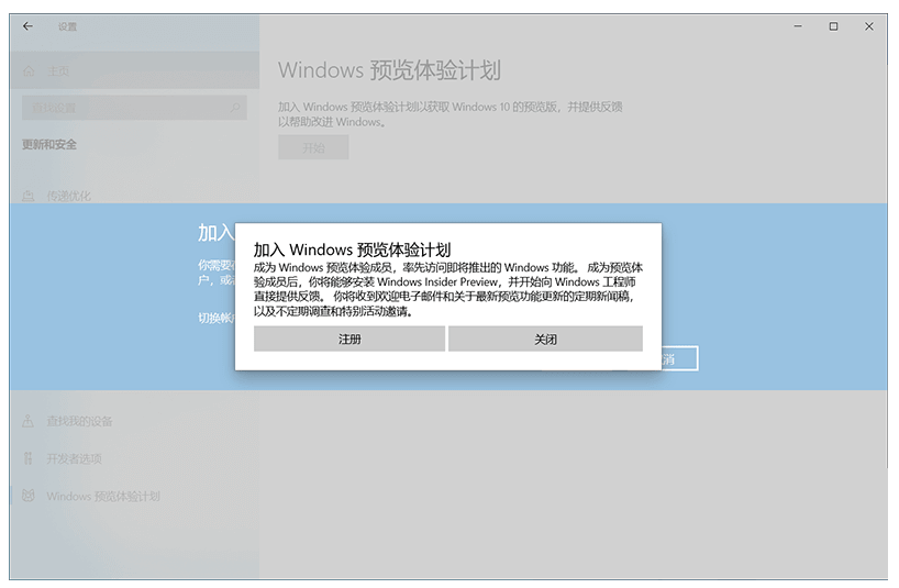 3、隨后會彈出這個界面,提示需要注冊帳戶才能獲取Insider Preview內部版本,點擊注冊。