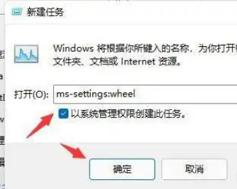 3、勾選“以系統管理權限創建此任務”選項,輸入“ms-settings:wheel”,回車“確定”。