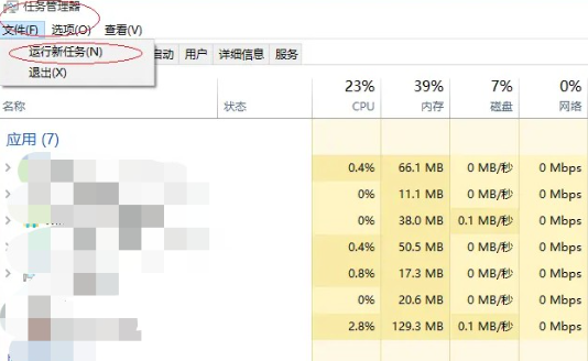3、點擊任務管理器左上角的“文件”,選擇“運行新任務”。
