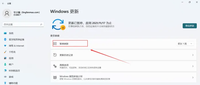 3、點擊“暫停更新”,選擇“延長一周”或者更久。