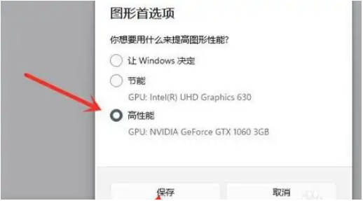 6、在圖形首選項中點擊“高性能”并點擊保存就可以啦。
