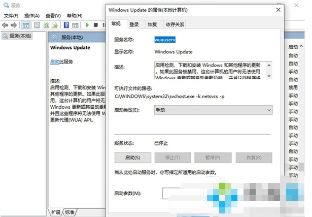 2、然后找到并打開【Windows Update】服務,然后點擊【停止】,再將啟動類型改為【手動】;