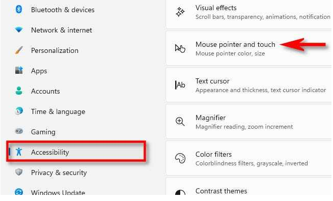 2.接著選擇左側的Accessibility輔助功能設置里的Mouse pointer and touch進入其中;