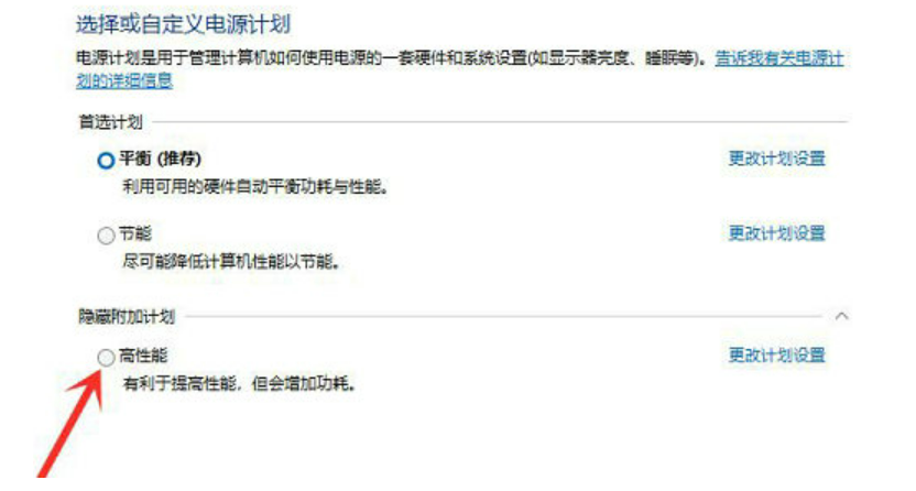 4、勾選需要設置的電源計劃,例如點擊【顯示附加計劃】,勾選【高性能】。設置完成。