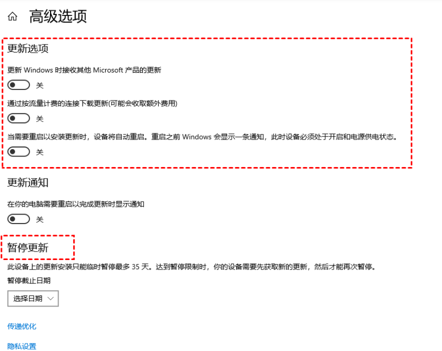 3、在高級選項中,您可以將“更新選項”中項目全部關閉。
