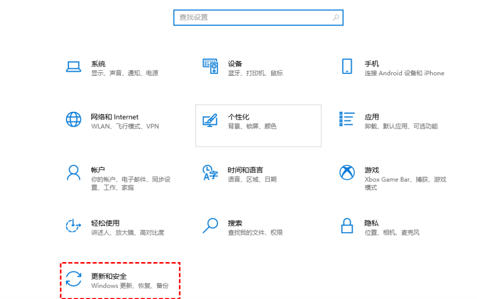 1、按“Windows + I”鍵,打開Windows設置,再單擊“更新和安全”。