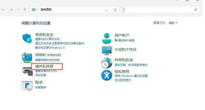 2、在打開的窗口界面中,點擊硬件和聲音。