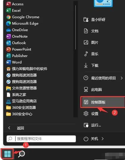 1、首先點擊打開開始菜單,鼠標點擊windows系統中的控制面板。