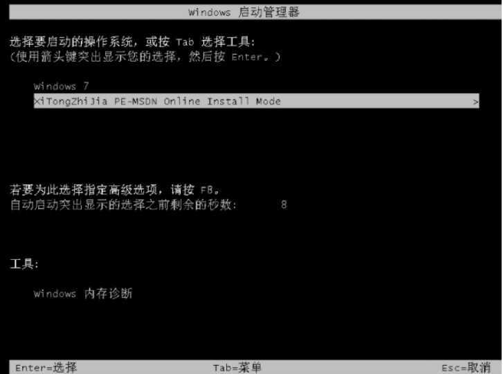 4.電腦重啟后,進入啟動選項頁面,選擇帶有光標的選項按回車進入pe系統。