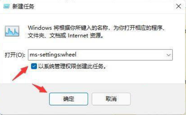 2、勾選“以系統管理權限創建此任務”選項,輸入“ ms-settings:wheel ”,回車“確定”。