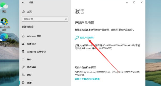 在更新與安全的頁面中點擊【激活】,此時右側會出現一個【更改產品密鑰】的選項。