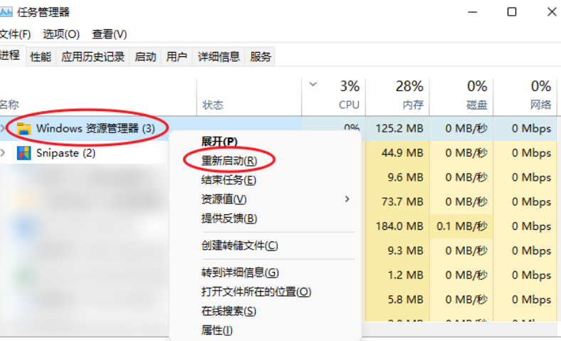 3、使用Ctrl+Shift+ESC快捷鍵打開任務管理器,找到“Windows資源管理器”?!“醋 癈trl”鍵讓列表不跳動,選中“Windows資源管理器”右鍵選擇“重新啟動”。