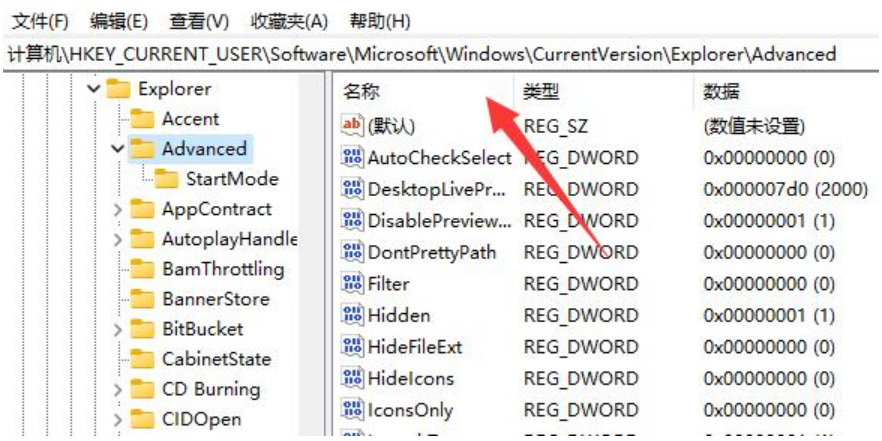 3、然后進入“計算機\HKEY_CURRENT_USER\Software\Microsoft\Windows\CurrentVersion\Explorer\Advanced”位置。