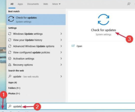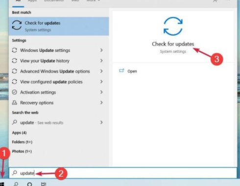 12.重新啟動后,根據點擊“開始”按鍵,輸入update并從結果中選擇選項,轉至Windows 升級菜單。