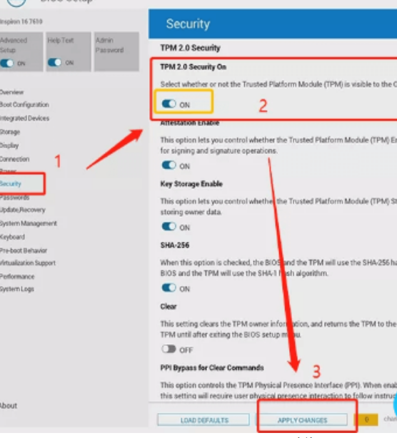 3、然后,找到左側的“Security”選項,選擇“TPM 2.0 Security”然后進行勾選“on”,開啟tpm2.0。