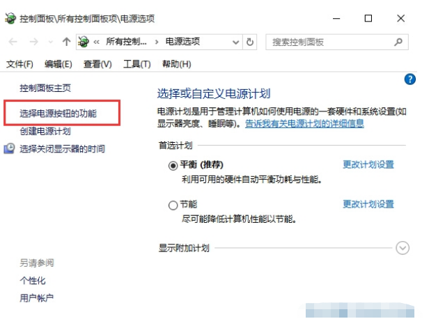 4、然后點擊“選擇電源按鈕的功能”鏈接;