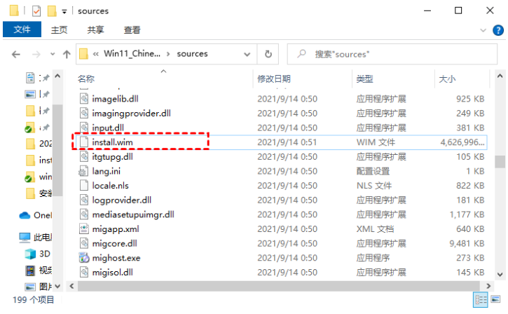 2、找到映像文件的“source”文件夾。復制Win10中的“install.wim”文件,然后粘貼到并覆蓋掉Win11中的對應文件。