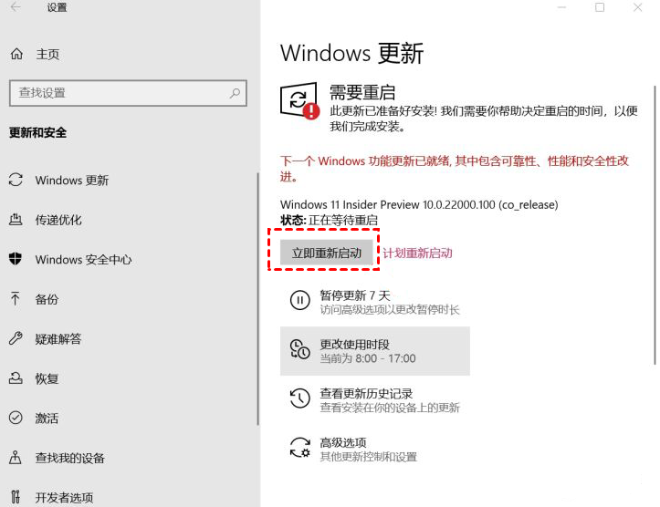 2、然后點擊“立即重新啟動”或選擇“計劃重新啟動”,重啟時系統會自動安裝Win11系統完成。