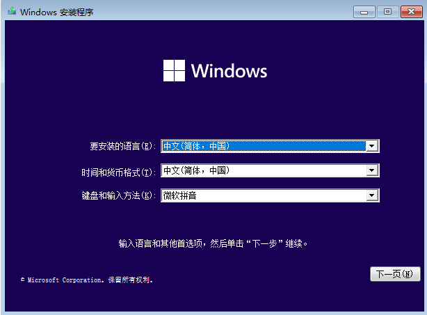 2、將創建的u盤連接到電腦,在出現設置Windows的界面中,設置“要安裝的語言”、“時間”和“輸入法”等。