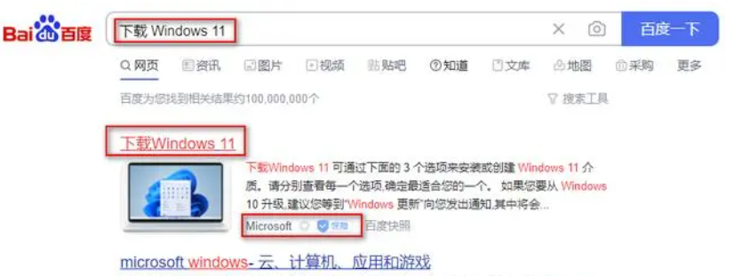 1.百度搜索輸入:"下載 windows 11",點擊搜索結果,進入微軟官網下載界面。
