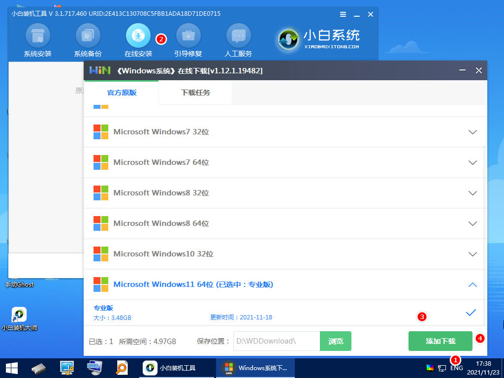 分區成功后,打開桌面的小白裝機工具,選擇在線安裝,然后選擇需要重裝的windows鏡像文件,點擊下面的添加下載。這個過程需要保持網絡的暢通,如果電腦無法聯網,需要單獨下載系統鏡像后再安裝。