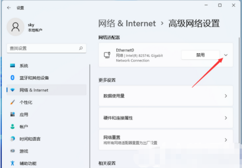 2、網絡 & Internet設置窗口,右側找到并點擊高級網絡設置(查看所有網絡適配器,網絡重置);