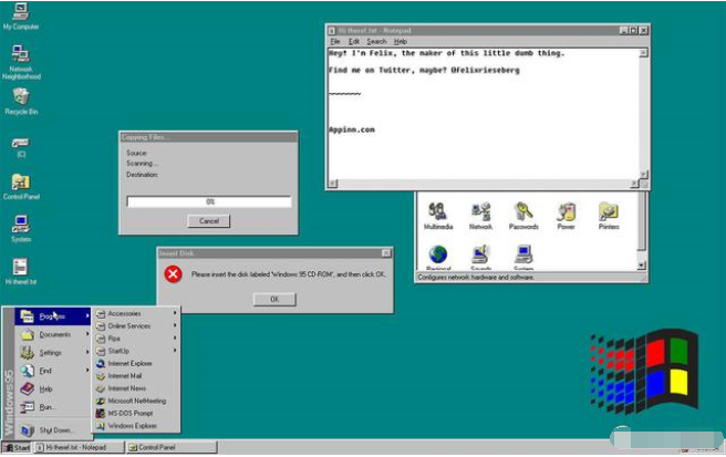 Windows95的開關機聲音非常大。往往藍屏以后就只能重新開機,然后又要聽一次。Win95流弊的地方在于有了即插即用的理念,以前在Dos下面安裝驅動,就需要把驅動放在指定的文件夾,然后通過編輯Autoex bat文件以及system.sys文件“描述”驅動文件在那里。Win95貌似是第一個可以用光盤安裝的系統,Win95可以用軟盤安裝的,貌似win98可以,保守算,怕是過百張,畢竟軟盤不過1.44MB而已。