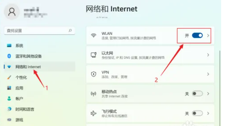 三、點擊【網絡和Internet】,找到【WLAN】選項,將開關按鈕打開。