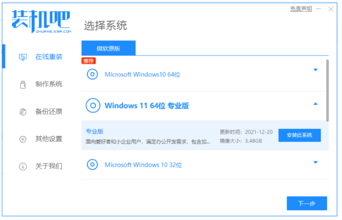 1、首先點擊打開電腦瀏覽器搜索并下載安裝好裝機吧一鍵重裝系統軟件,點擊打開后選擇需要的win11系統點擊下一步。