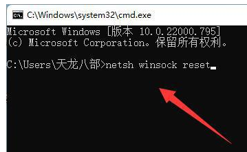 4、打開后輸入“netsh winsock reset”回車再重啟電腦試試看應該就可以了。