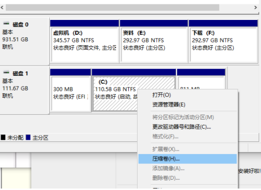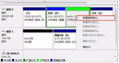 4、完成壓縮后會出現新的可用空間。用鼠標右鍵單擊并選擇新的簡單卷,在向導頁上單擊下一步來完成創建好分區。