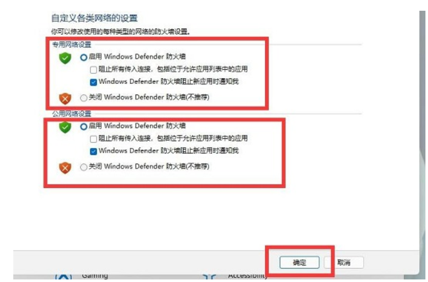 5、然后在專用和共用網絡設置中,分別勾選最下方的“關閉windows defender防火墻”,再確定保存即可。
