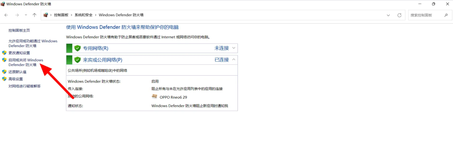 4、點擊界面左側的“啟用或關閉windows defender防火墻”。