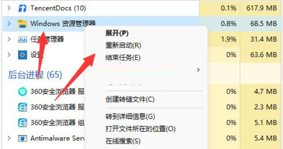 1、在任務管理器里找到“資源管理器”,然后右鍵選擇它“重新啟動”。