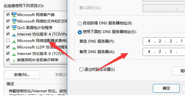 5、接著點擊“internet協議版本4”,在首選DNS中輸入“4.2.2.1”,備用DNS中輸入“4.2.2.2”。
