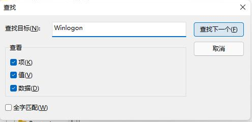 4、接著按下鍵盤“ctrl+f”打開查找,然后在其中查找“Winlogon”。