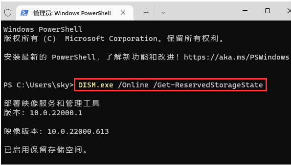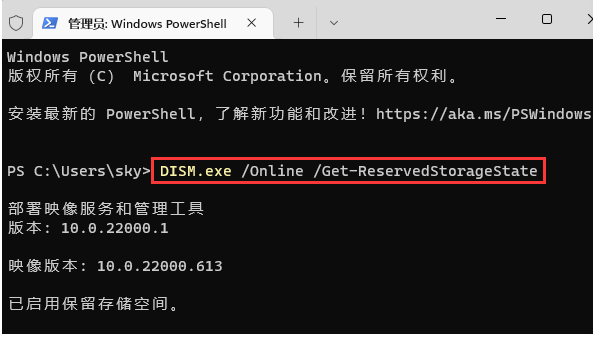 步驟二:使用DISM快速禁用或啟用保留空間:查詢系統保留空間是否啟用DISM.exe /Online /Get-ReservedStorageState。