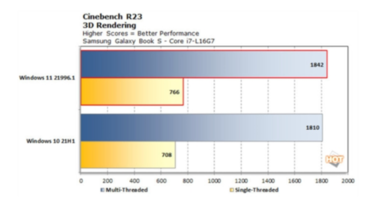 3.渲染,在Cinebench R23中,Win11在單線程測試中呈現出了約8.2%的優勢。Core i5-L16G7處理器在Win11中表現出了更強的性能。