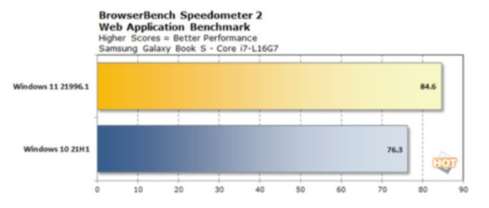 2.瀏覽器跑分,經過測試也顯示出了Win11的性能要更好,使用同樣的Chrome91,Win11對比Win10有10%的性能優勢。