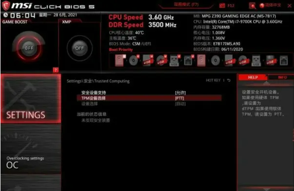 1、重啟按DEL進入BIOS,按F7進入高級模式,點擊進入Settings的【安全】選項,再進入Trusted Computing。