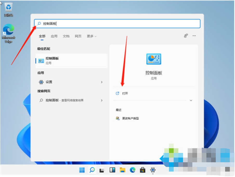 2、在搜索欄中輸入【控制面板】,然后點擊如圖的打開即可。