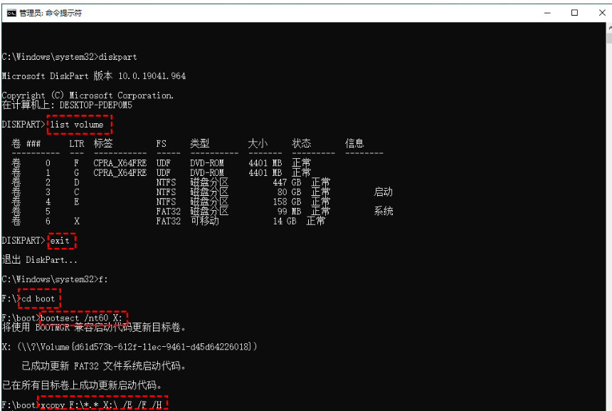 xcopy F:\*.* X:\ /E /F /H (將 F 和 X 更改為帶有 Windows 11 ISO 映像和U盤的盤符。)
