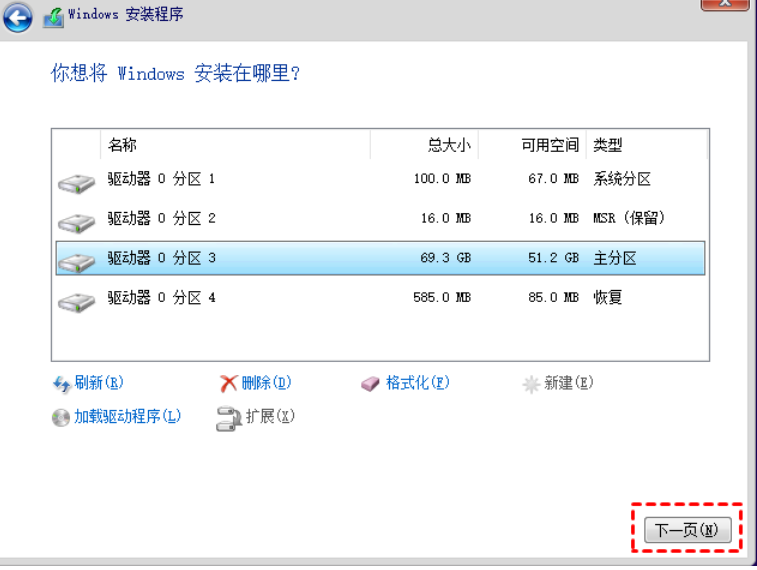 9、選擇您要安裝Windows 11操作系統的目標磁盤,然后單擊“下一頁”。