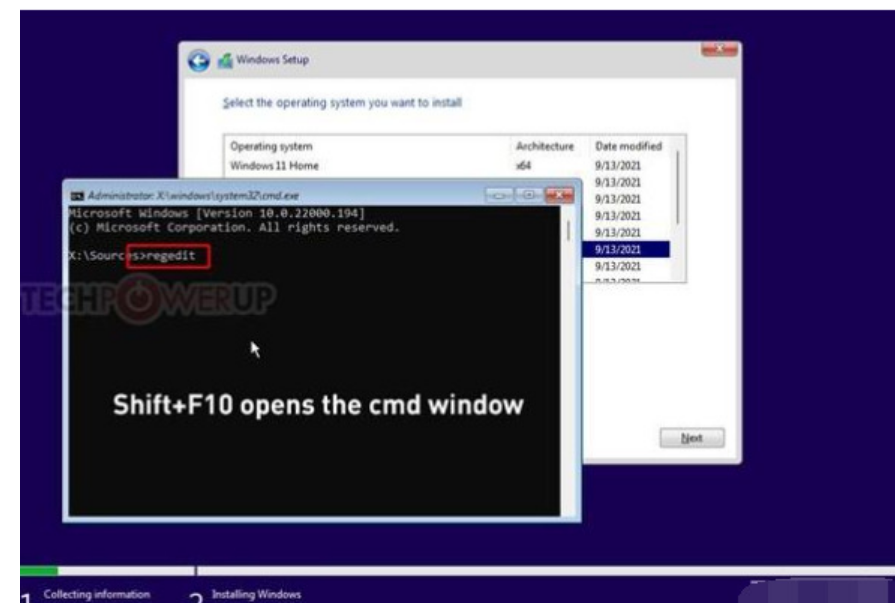 3、當在Windows11系統安裝過程中了無法安裝的提示時,我們就點擊后退按鈕,接下來同時按下Shift+F10調出命令提示符,然后輸入rgedit命令打開注冊表編輯器,并把編輯好的注冊表文件導入,關閉所有窗口后點擊下一步就可以正常安裝win11系統了。