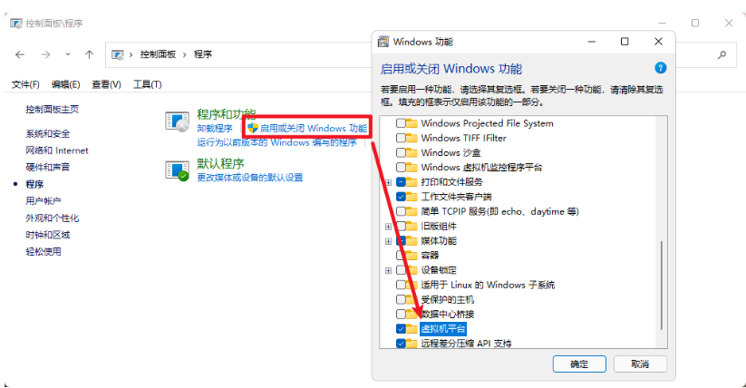 打開控制面板 > 程序 > 啟用或關閉 Windows 功能,勾選虛擬機平臺,確定、重啟電腦即可。